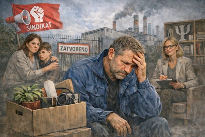 Jedan primer iz sindikalne prakse to jasno oslikava. U jednom industrijskom preduzeću u centralnoj Srbiji, tokom procesa restrukturiranja, 68 radnika je proglašeno tehnološkim viškom. Među njima je bio i radnik sa 27 godina staža, otac dvoje studenata. Nakon prijema rešenja, tri dana nije dolazio na posao niti se javljao porodici na telefon. Supruga se obratila sindikatu u strahu da mu se nešto nije dogodilo. Kasnije je priznao da je dane provodio u automobilu, parkiranom na periferiji grada, nesposoban da se vrati kući i deci pogleda u oči. Govorio je: „Bolje da me nema nego da me gledaju kao propalog čoveka.“ U narednim mesecima razvio je tešku depresiju i bio uključen u psihoterapijski tretman.