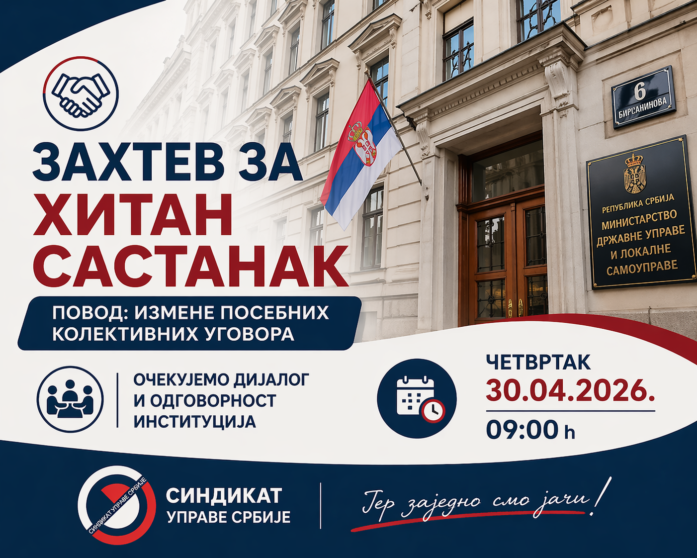 Sindikat uprave Srbije uputio je zvaničan zahtev Ministarstvu državne uprave i lokalne samouprave za održavanje hitnog sastanka na najvišem nivou, povodom izmena Posebnog kolektivnog ugovora za državne organe i zaposlene u jedinicama lokalne samouprave.